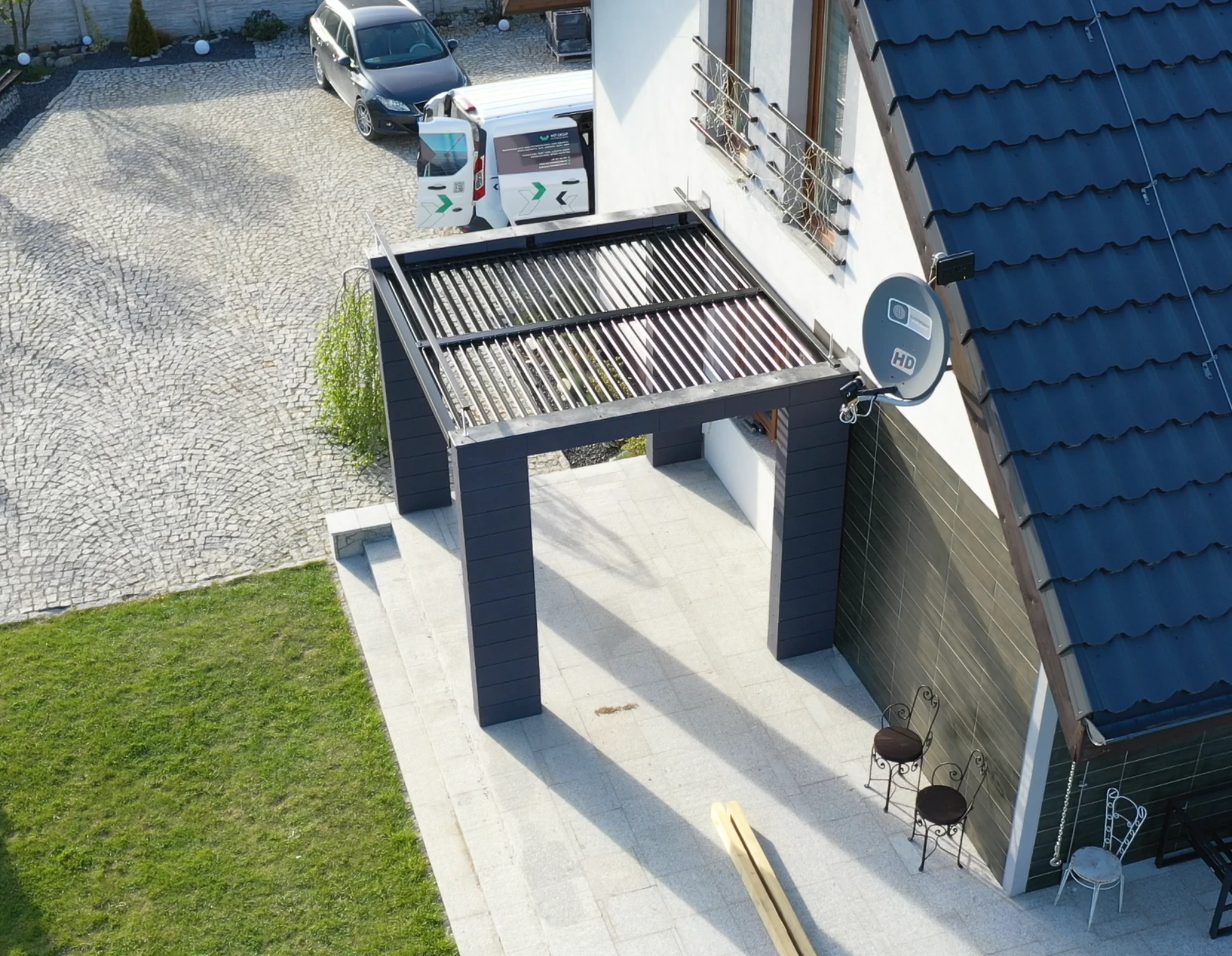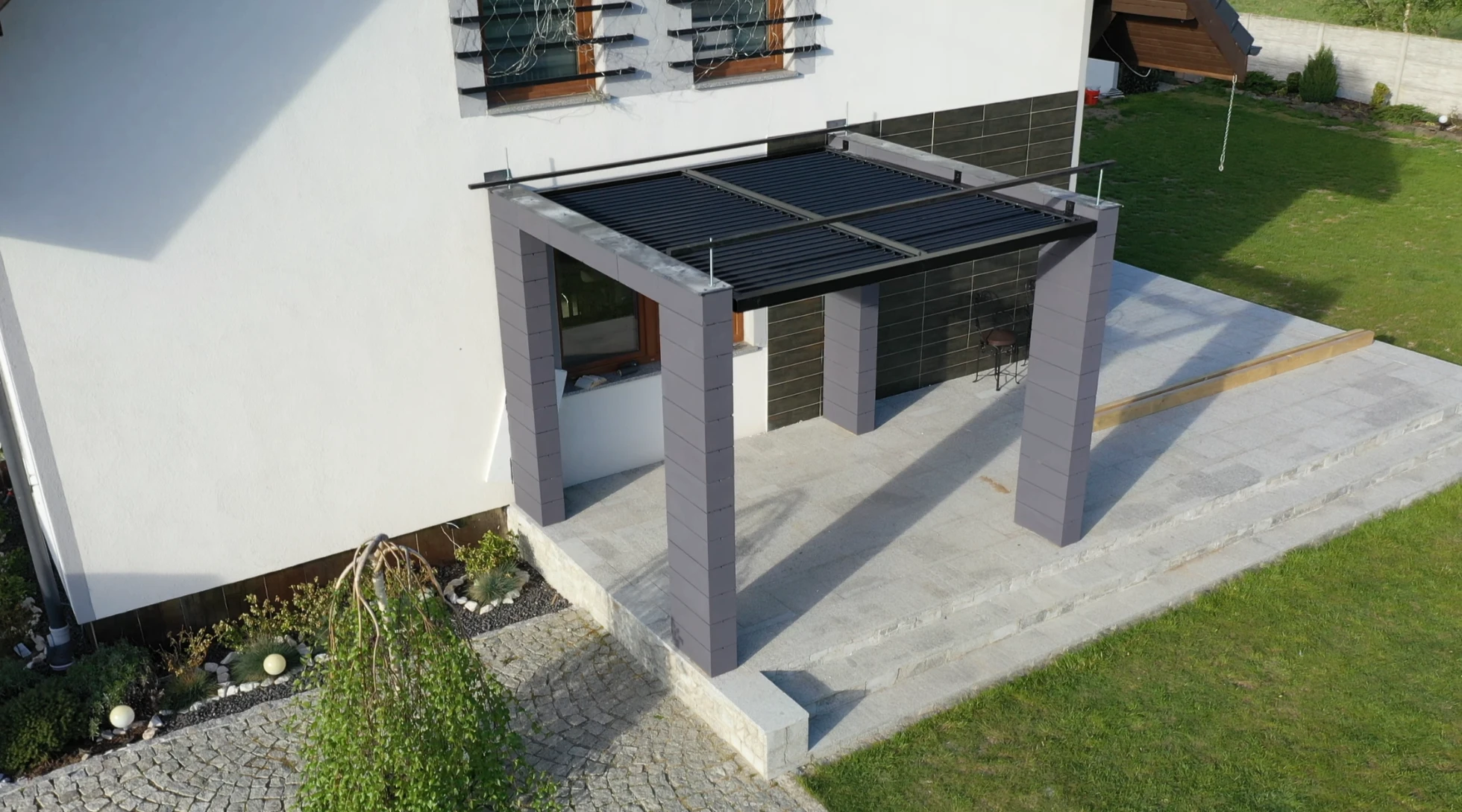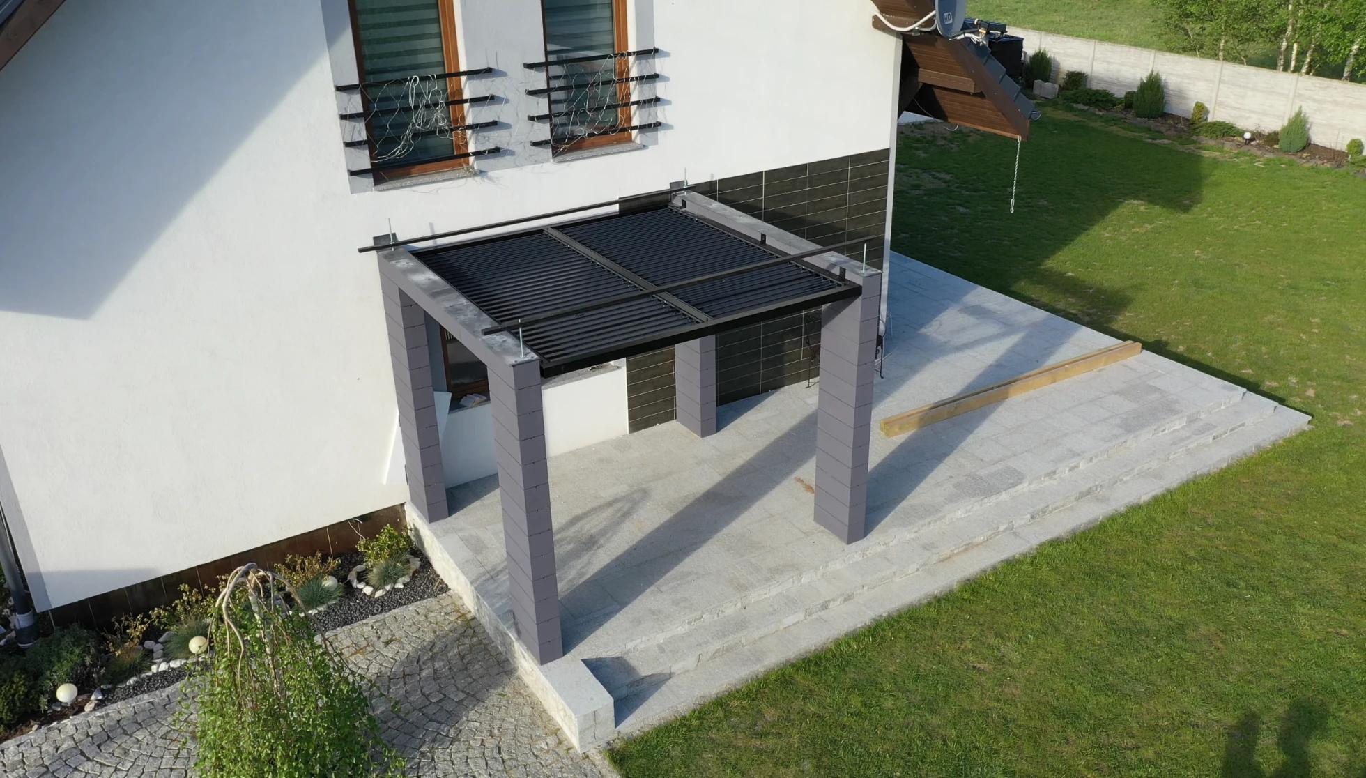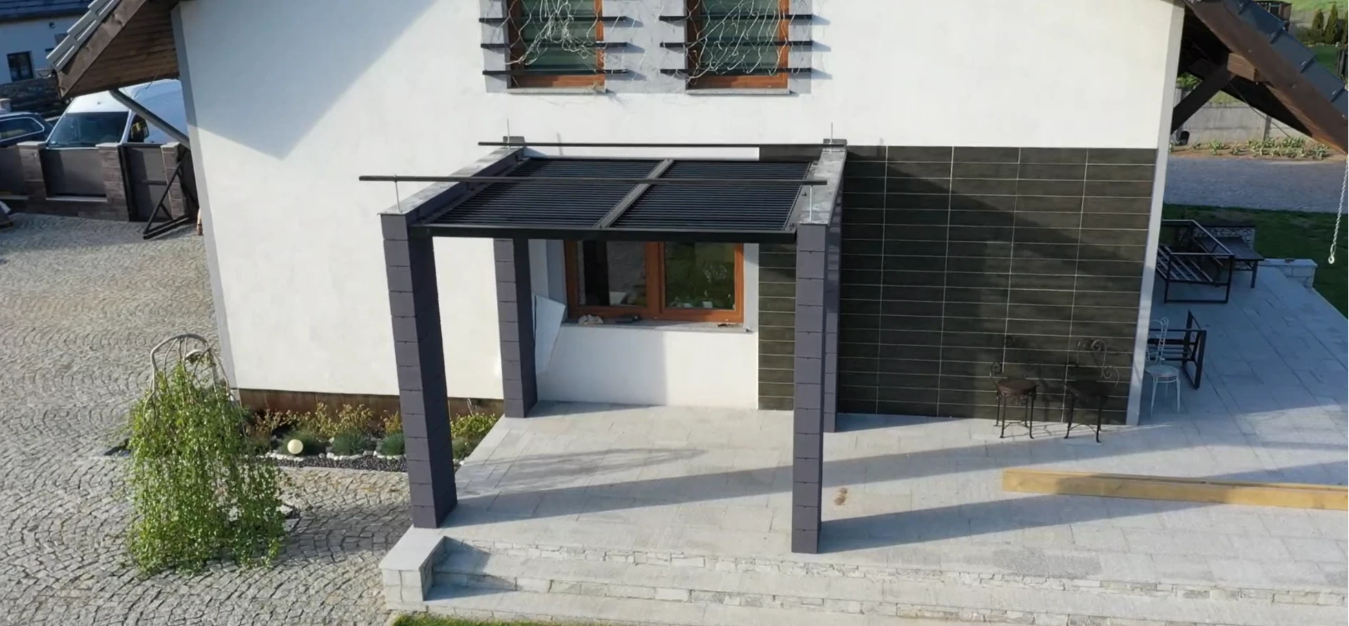 Tym razem firma WST GROUP wykonała zadaszenie przeciwsloneczne w systemie ruchomych paneli na istniejącej pergoli murowanej, realizacja w miejscowości Dębrznik k. Kamiennej Gory. Zamontowane na konstrukcji aluminiowej ruchome lamele regulują ilość wpadającego światła na taras. Dzięki temu rozwiązaniu użytkownik może komfortowo regulować ilość wpadających promieni słonecznych. Konstrukcja wykonana w całości z aluminium o przekroju 80 mm x 80 mm i grubości ścianki 3,0 mm. Gruby przekrój profili zapewnia nie tylko dużą stabilność konstrukcji, ale także trwałość na lata. Cała zabudowa zostala pomalowana proszkowo na kolor czarny RAL 9005, a panele aluminiowe regulowane zostały pokryte lakierem w kolorze antracytowym RAL 7016 mat, co nadało konstrukcji świeży i piękny wygląd, który doskonale komponuje się z różnymi rodzajami architektury.