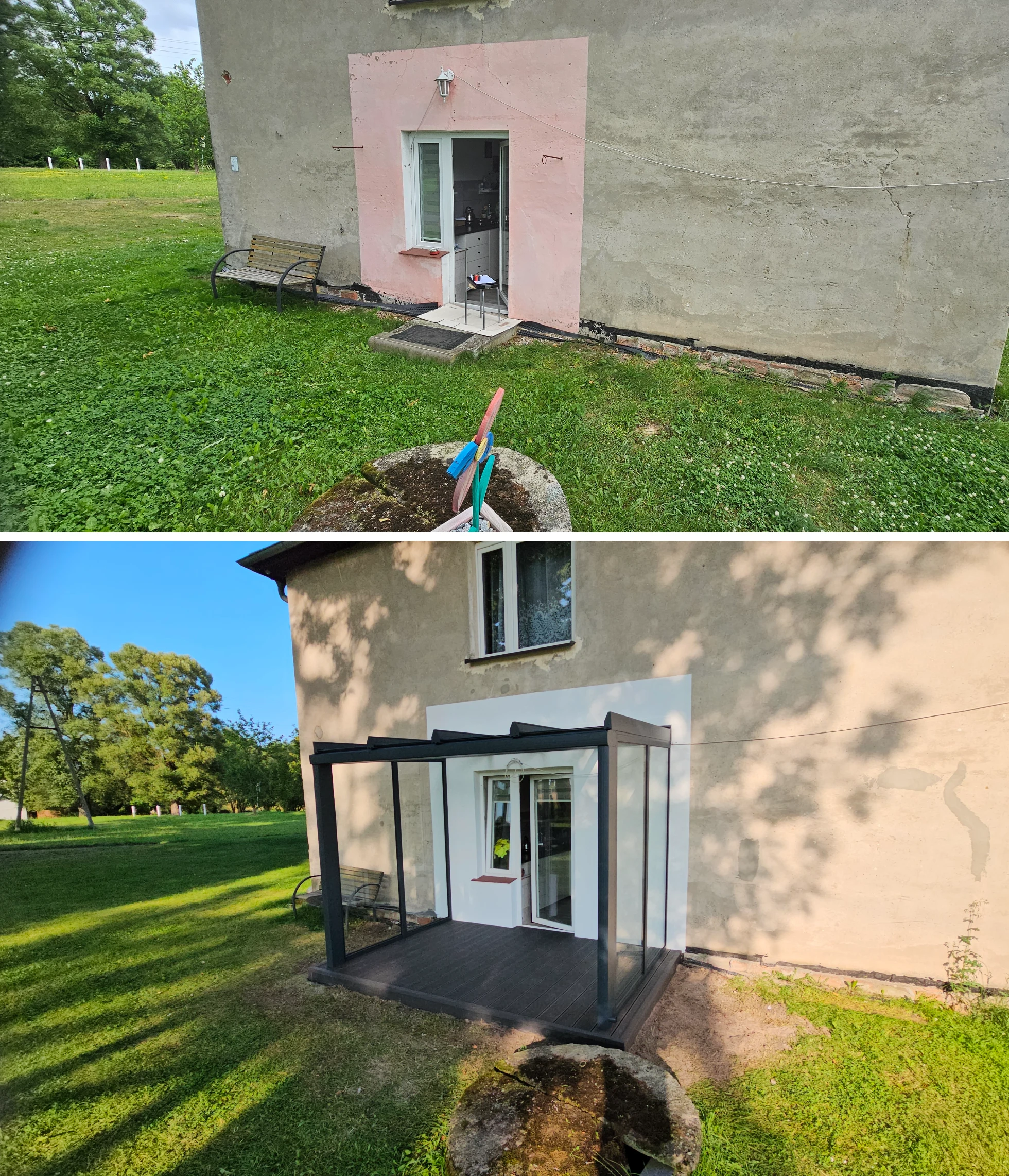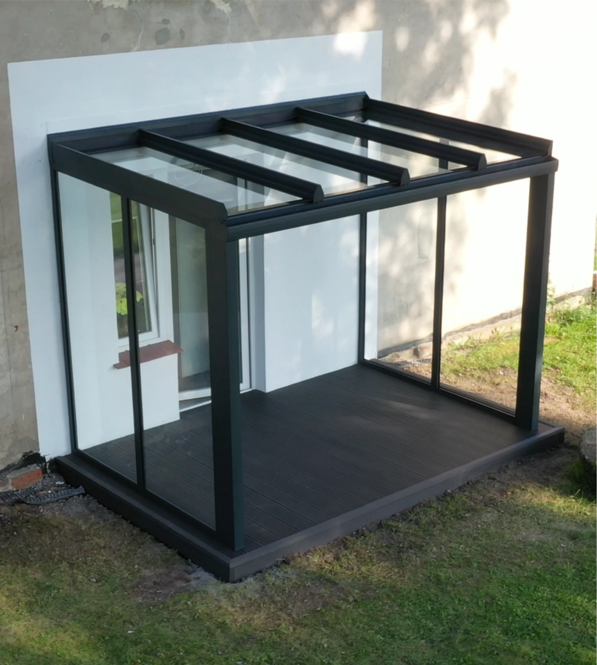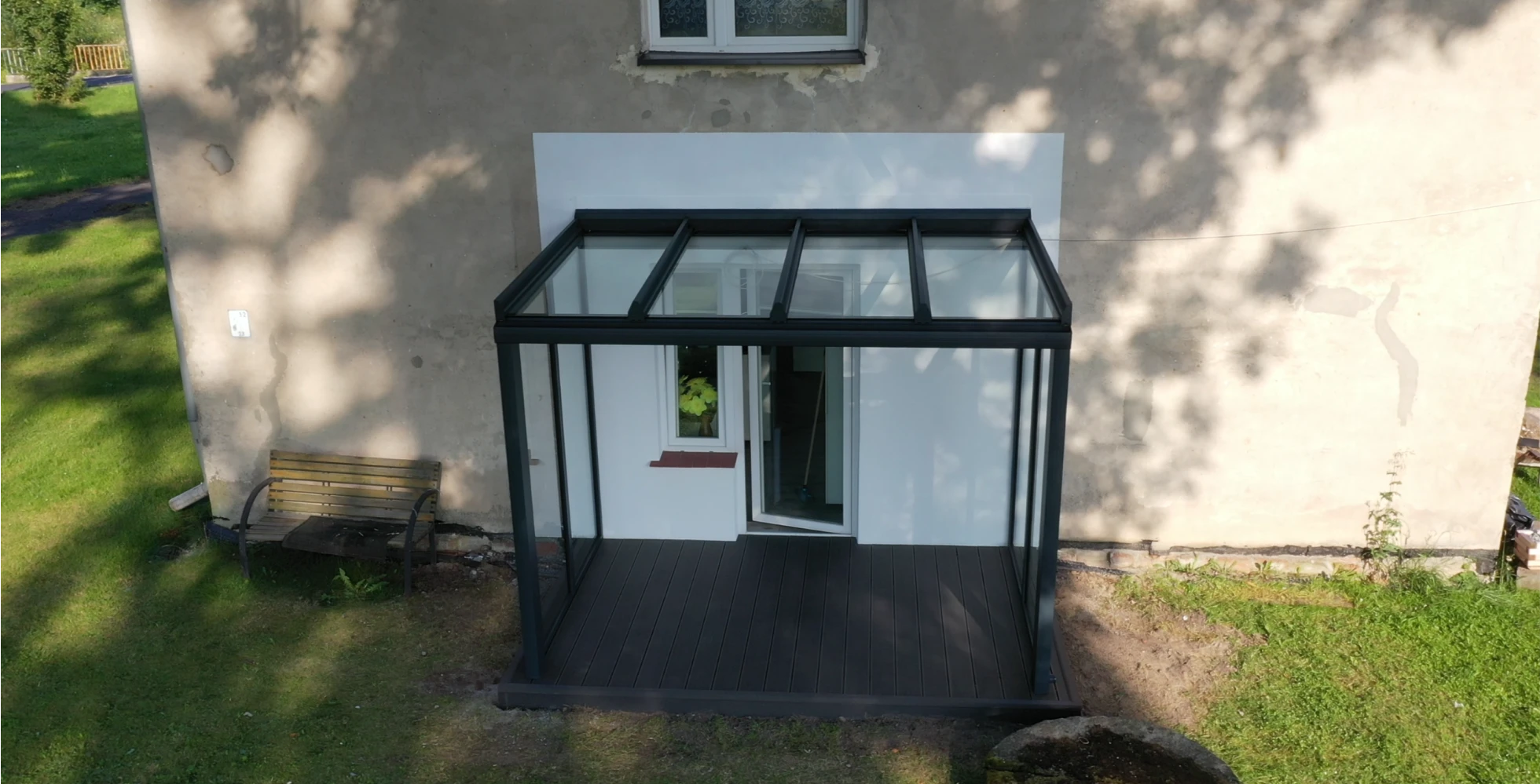 REALIZACJA: Wykonanie tarasu z deski kompozytowej oraz zadaszenia szklanego. WYMIAR ZADASZENIA: 300 x 200 x 240 (cm)