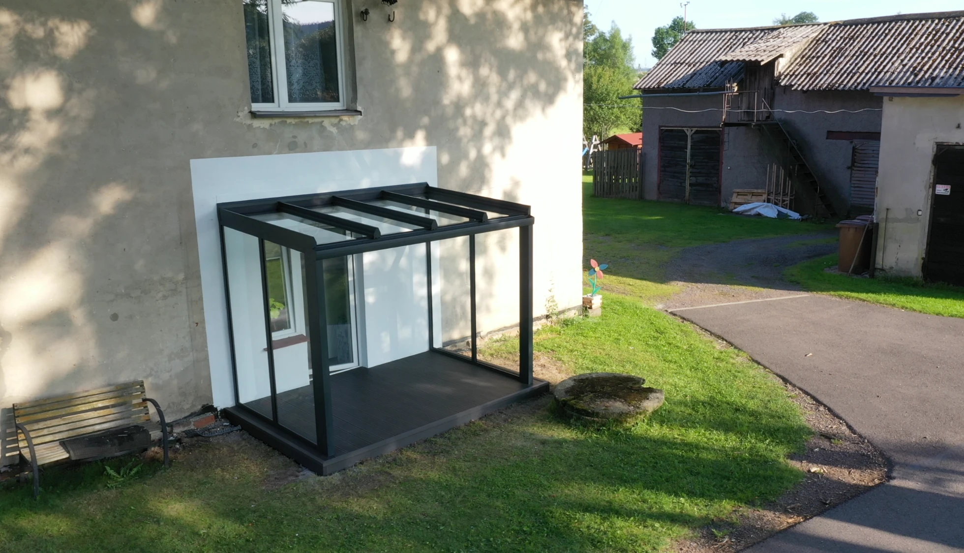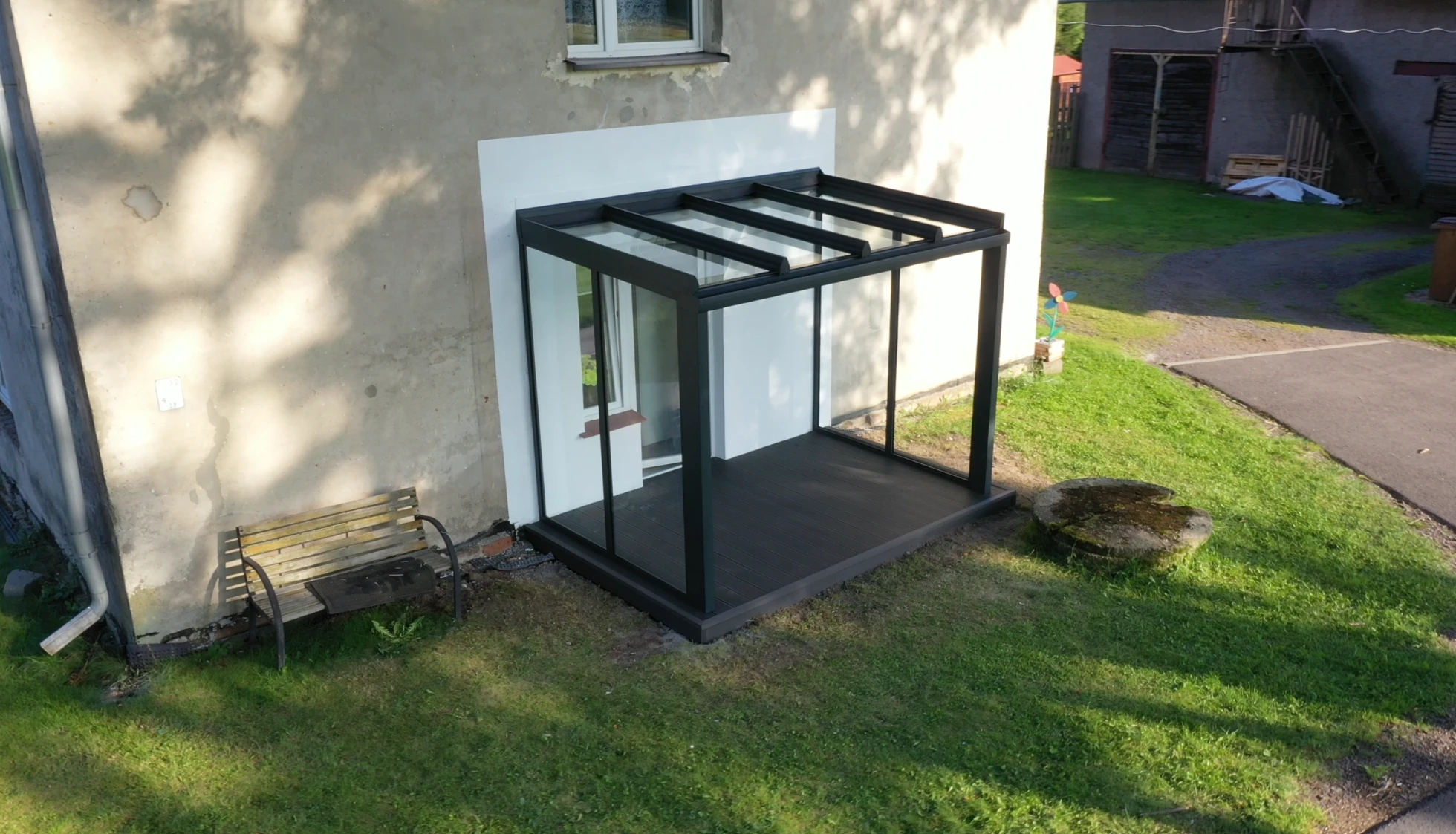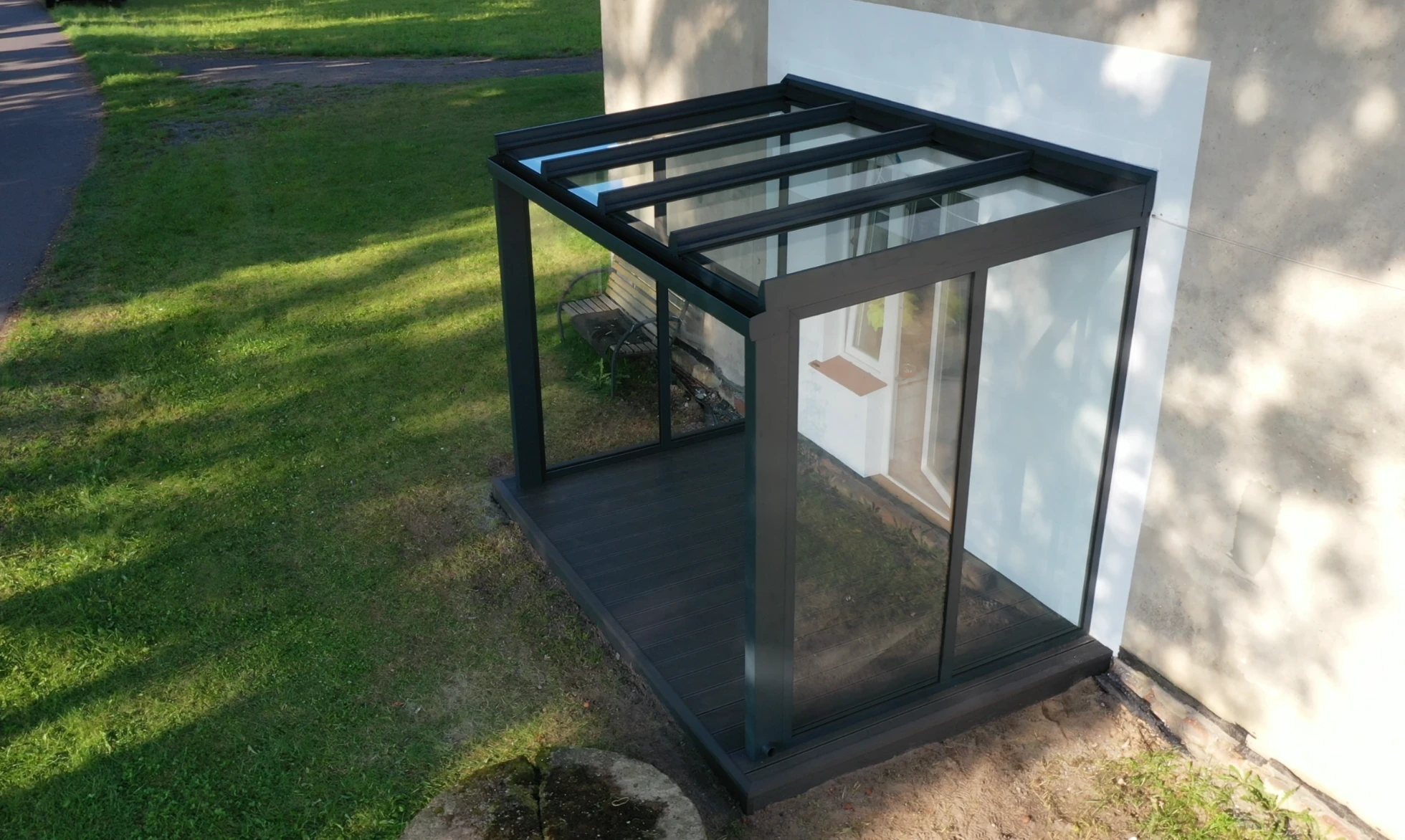 REALIZACJA: Wykonanie tarasu z deski kompozytowej oraz zadaszenia szklanego. WYMIAR ZADASZENIA: 300 x 200 x 240 (cm)
