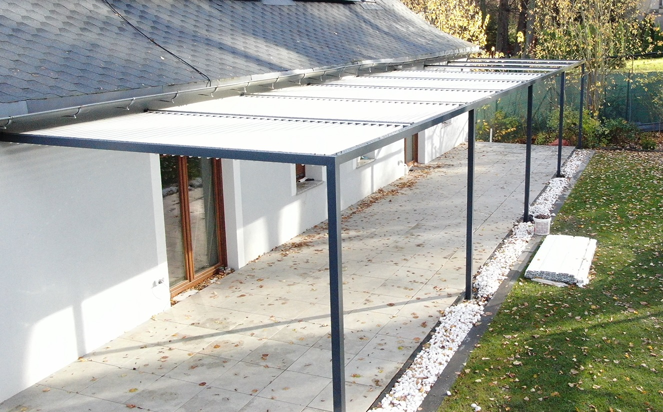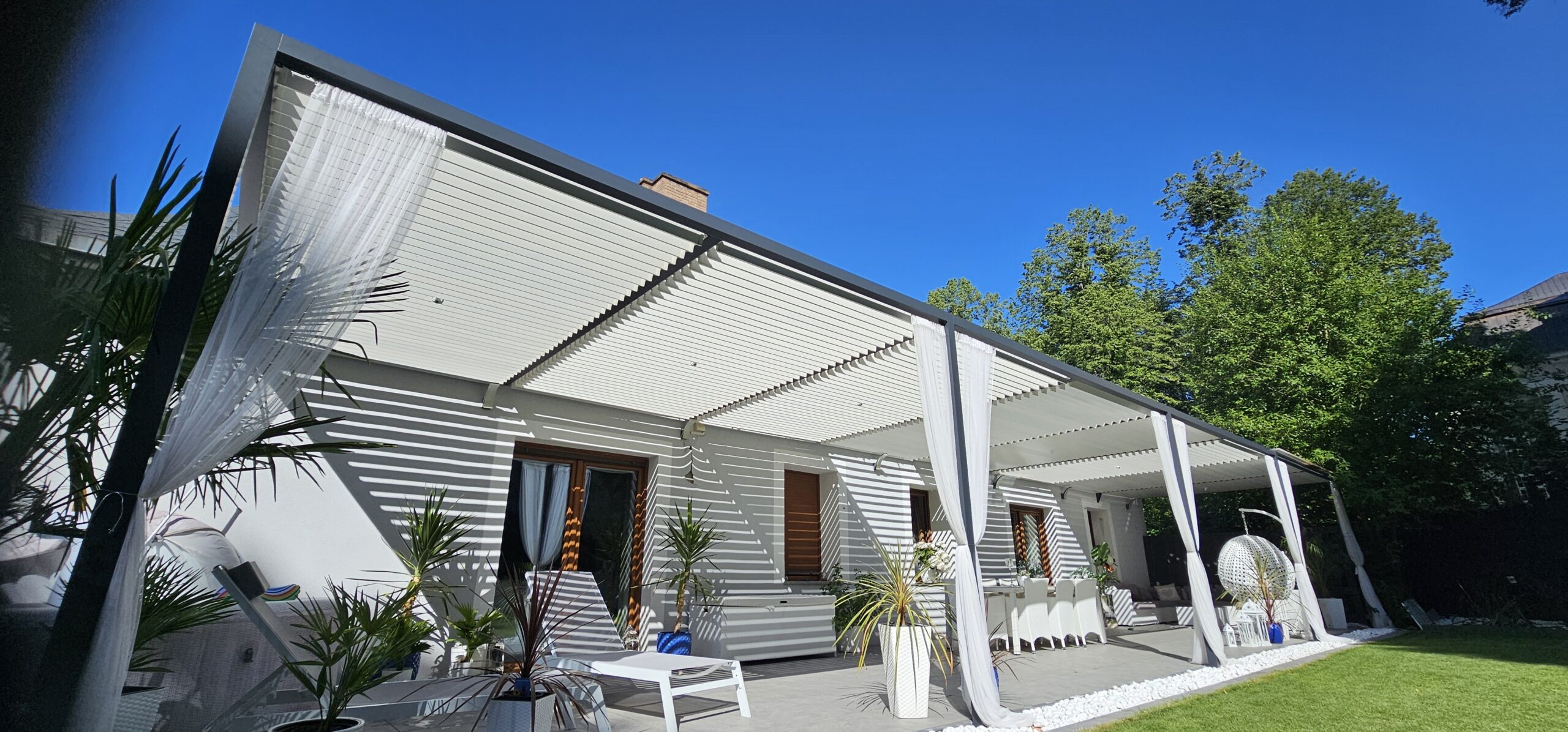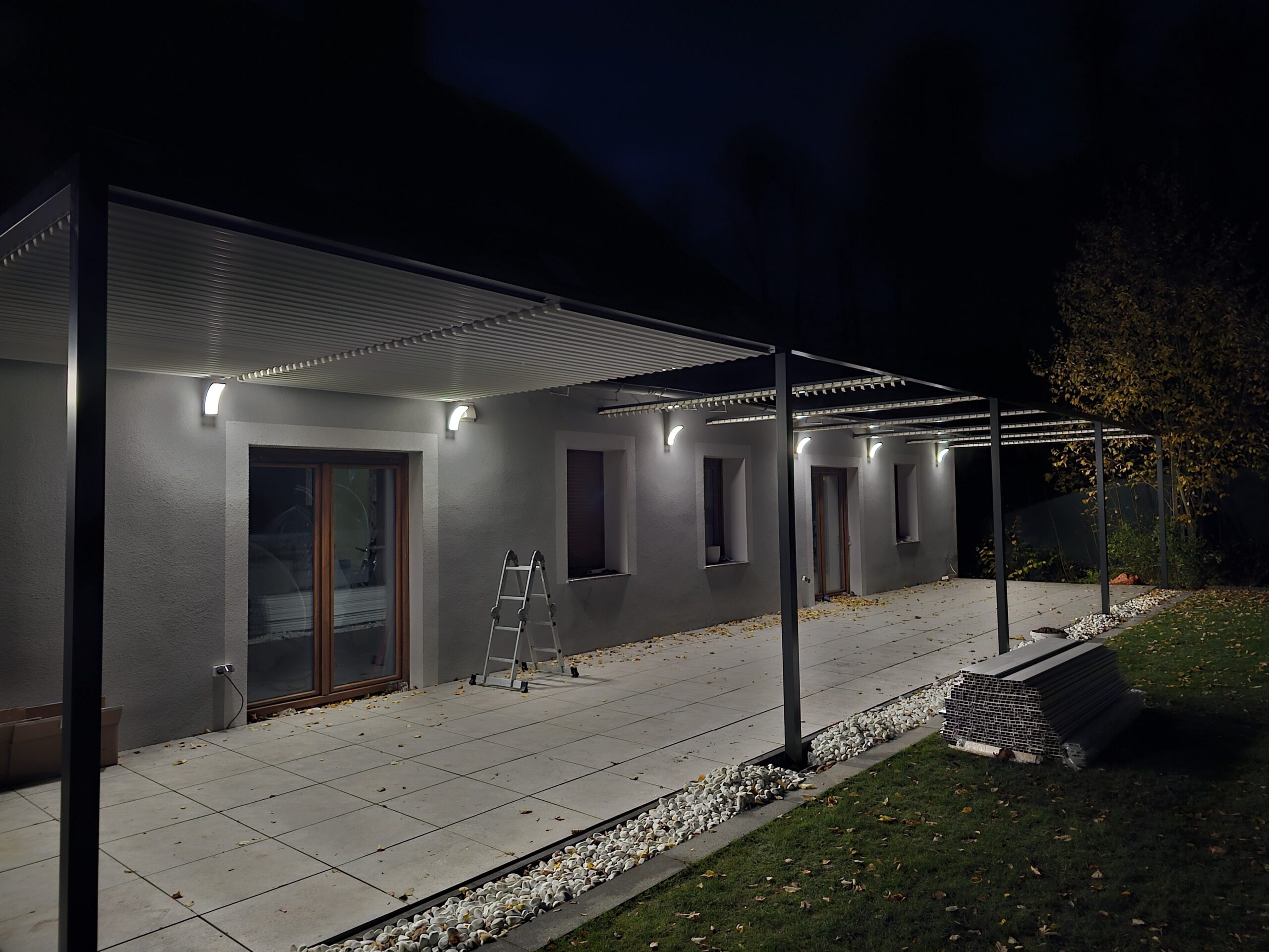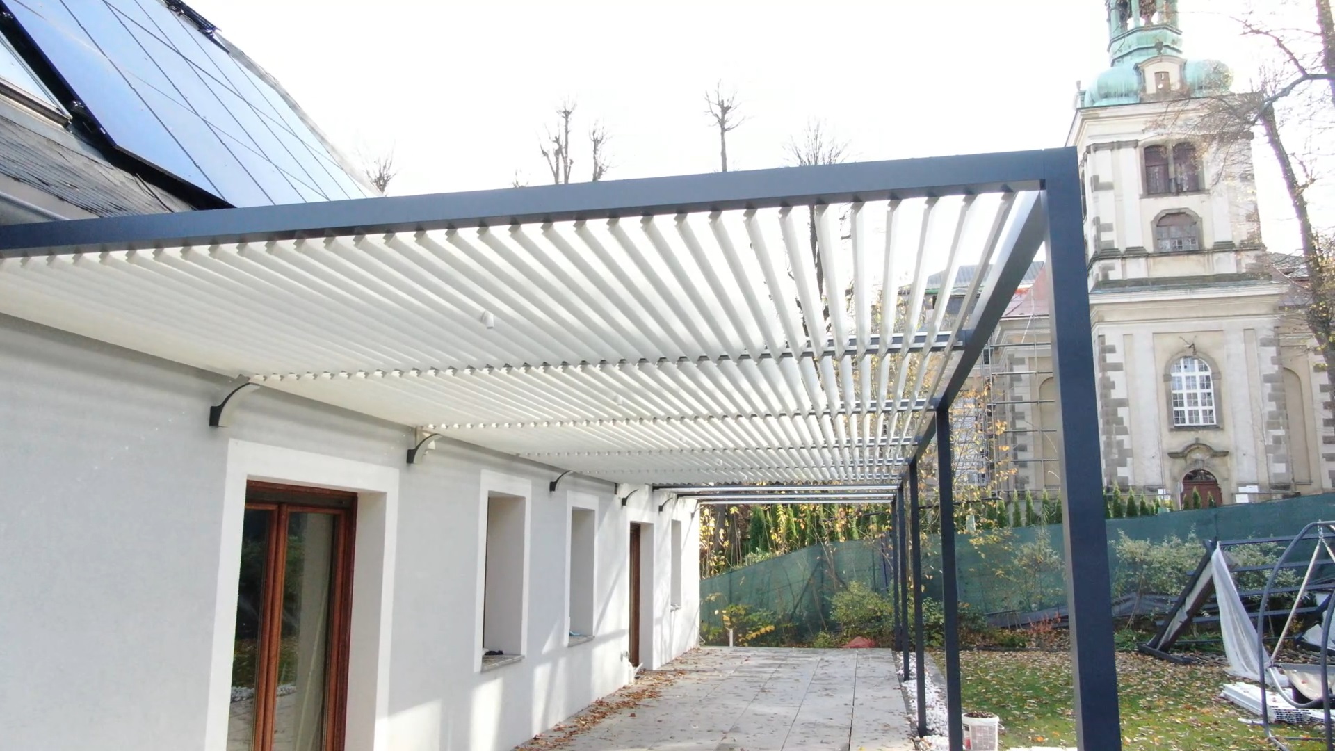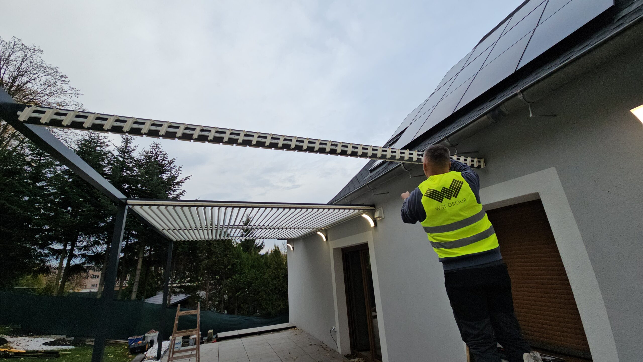 Montaż zadaszenia tarasu z systemem ruchomych paneli.