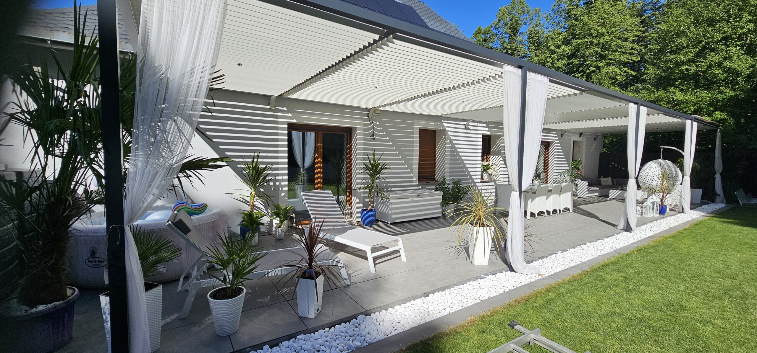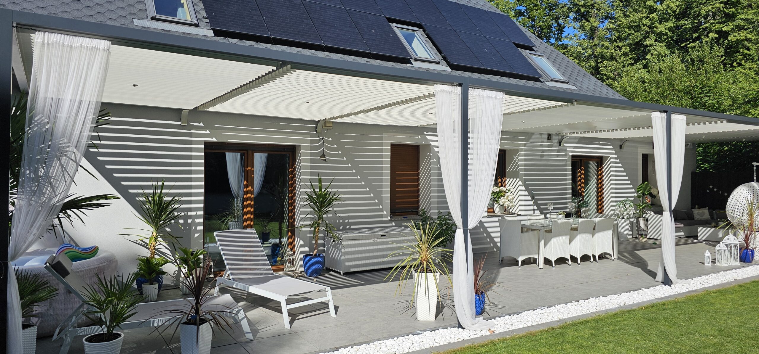 Realizacja w miejscowości Kamienna Góra woj. dolnośląskie. Firma WST GROUP wykonała Konstrukcję przeciwsłoneczną zadaszenia tarasu. Zabudowa była wykonywana na indywidualne zamówienie klienta. Zamontowane na konstrukcji aluminiowej ruchome lamele regulują ilość docierającego światła na taras. Dzięki temu rozwiązaniu użytkownik może komfortowo regulować ilość dostających się promieni słonecznych.