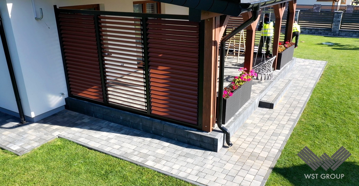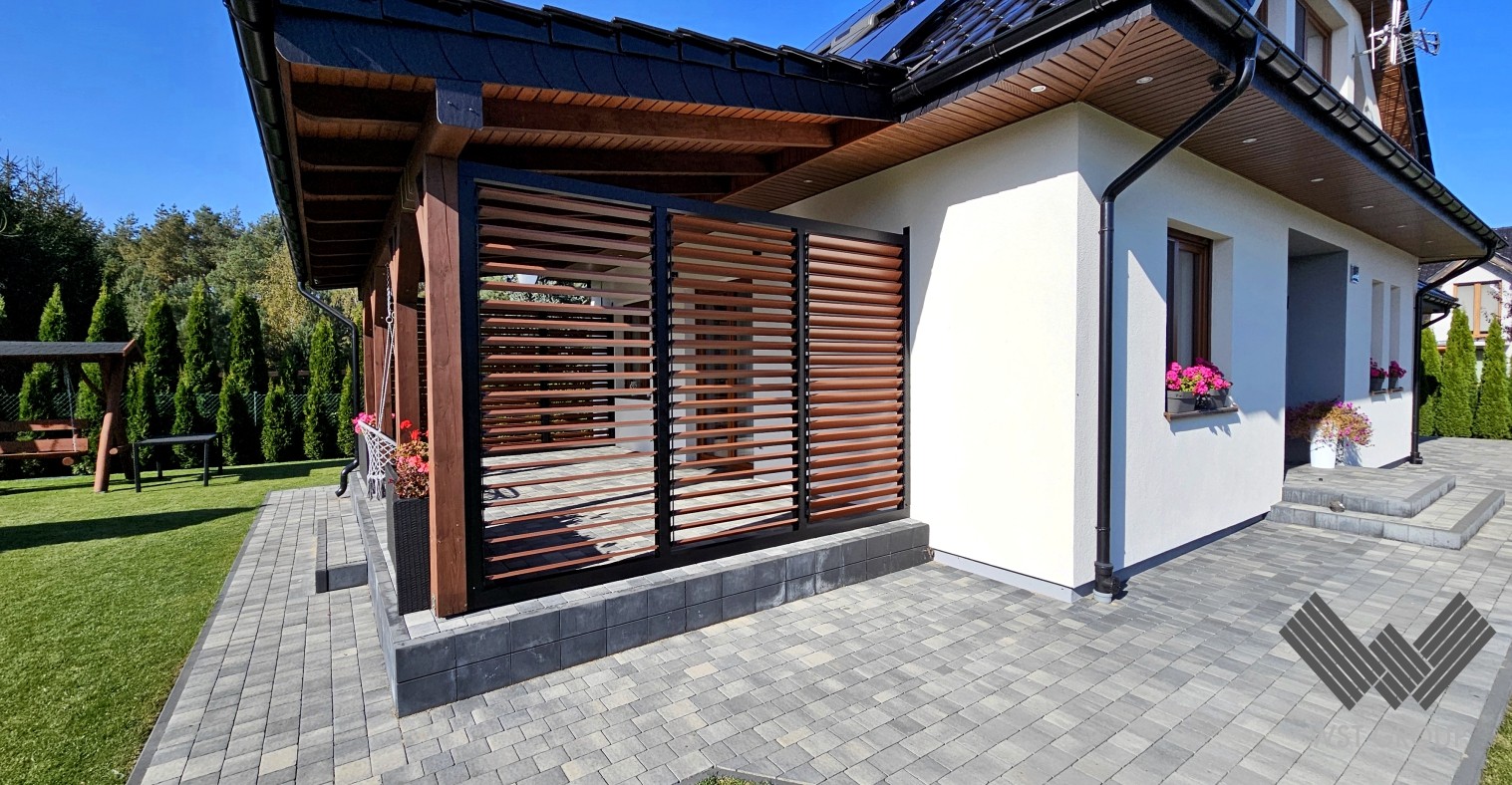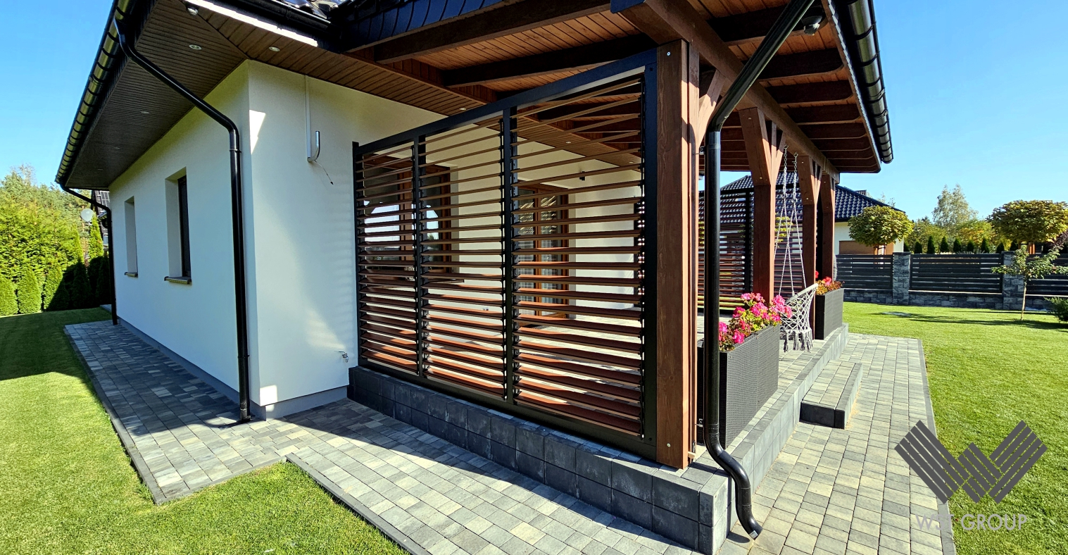 Realizacja w miejscowości Węglew – Kolonia k. Konina. Firma WST GROUP wykonała zabudowę ścianek przeciwsłonecznych pergoli drewnianej. Zabudowa była wykonywana na indywidualne zamówienie klienta. Zamontowane na konstrukcji aluminiowej ruchome lamele regulują ilość docierającego światła na taras. Dzięki temu rozwiązaniu użytkownik może komfortowo regulować ilość dostających się promieni słonecznych.