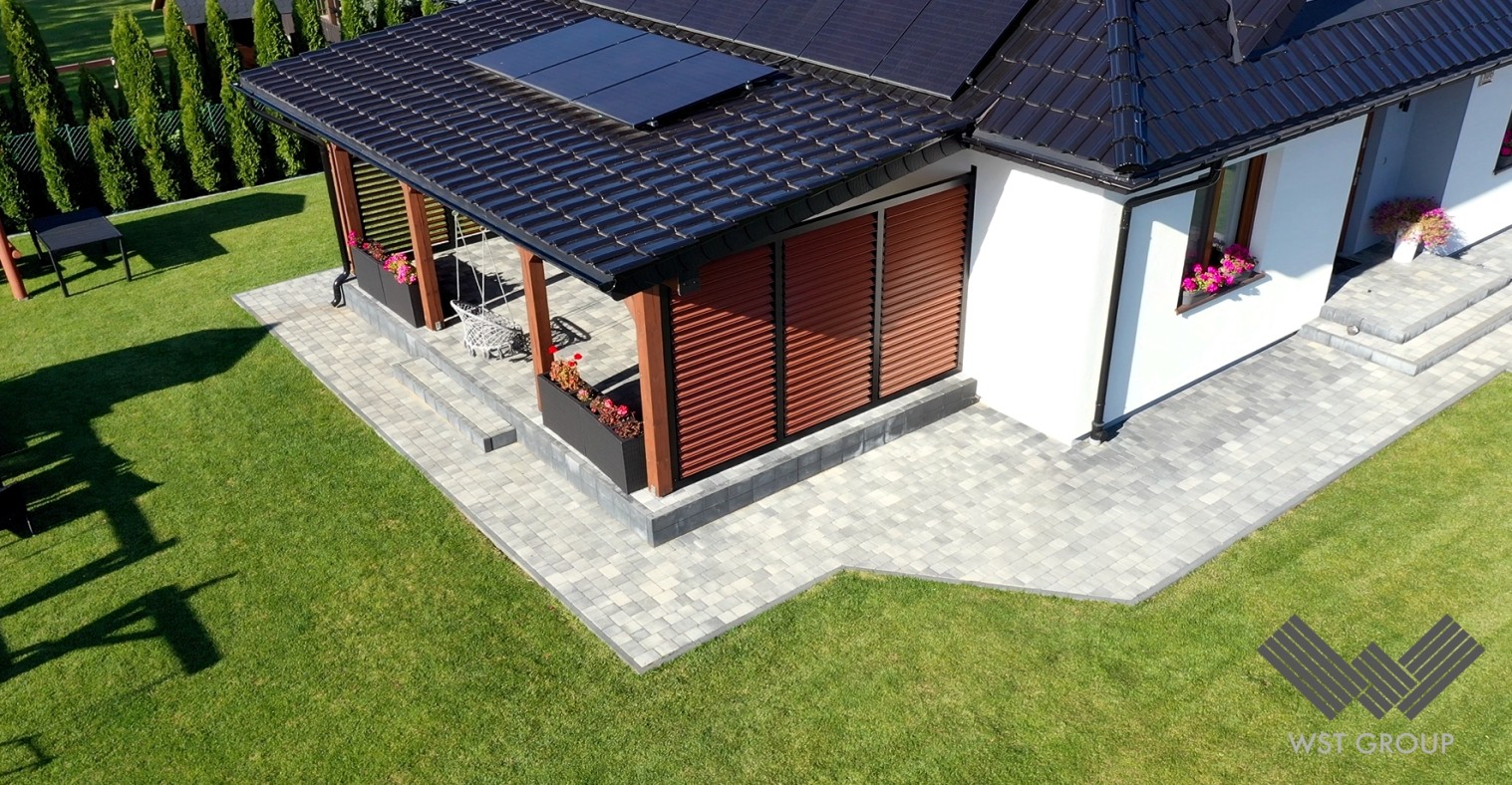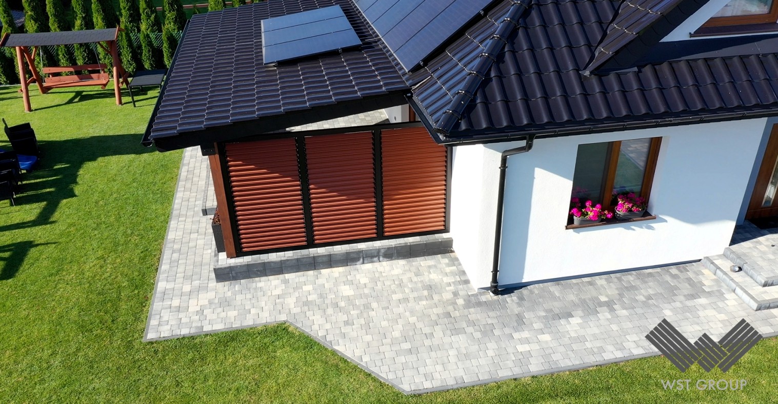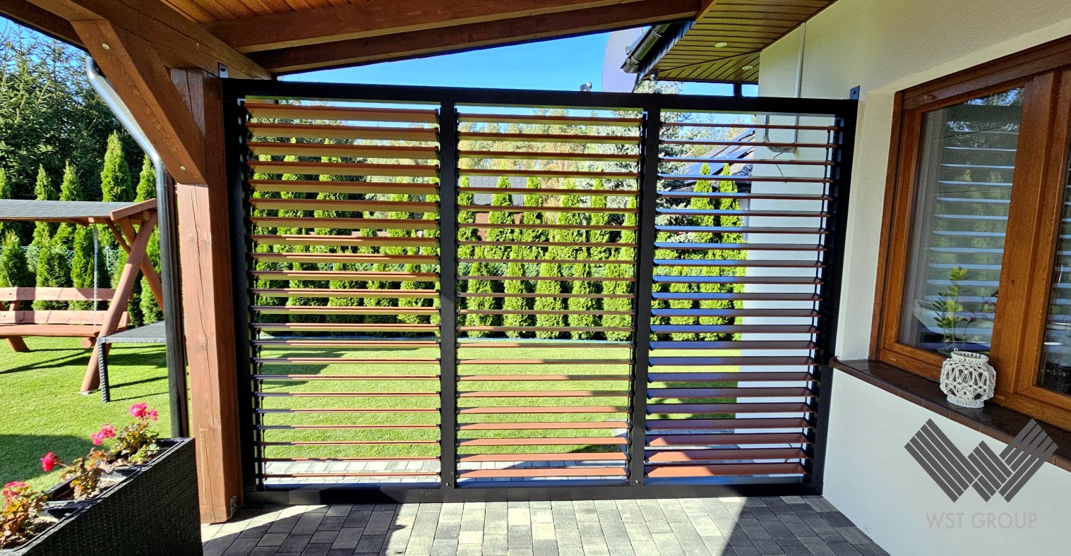 Realizacja w miejscowości Węglew – Kolonia k. Konina. Firma WST GROUP wykonała zabudowę ścianek przeciwsłonecznych pergoli drewnianej. Zabudowa była wykonywana na indywidualne zamówienie klienta. Zamontowane na konstrukcji aluminiowej ruchome lamele regulują ilość docierającego światła na taras. Dzięki temu rozwiązaniu użytkownik może komfortowo regulować ilość dostających się promieni słonecznych.