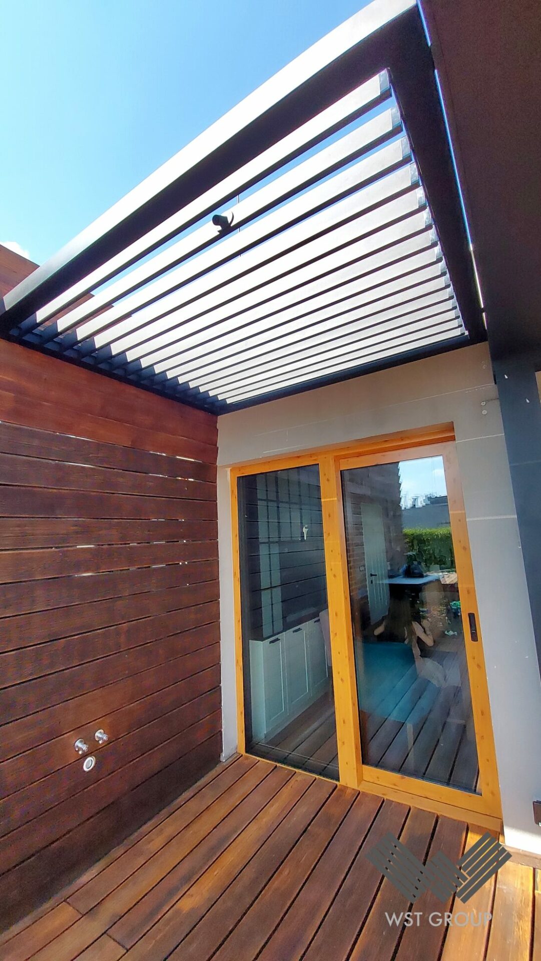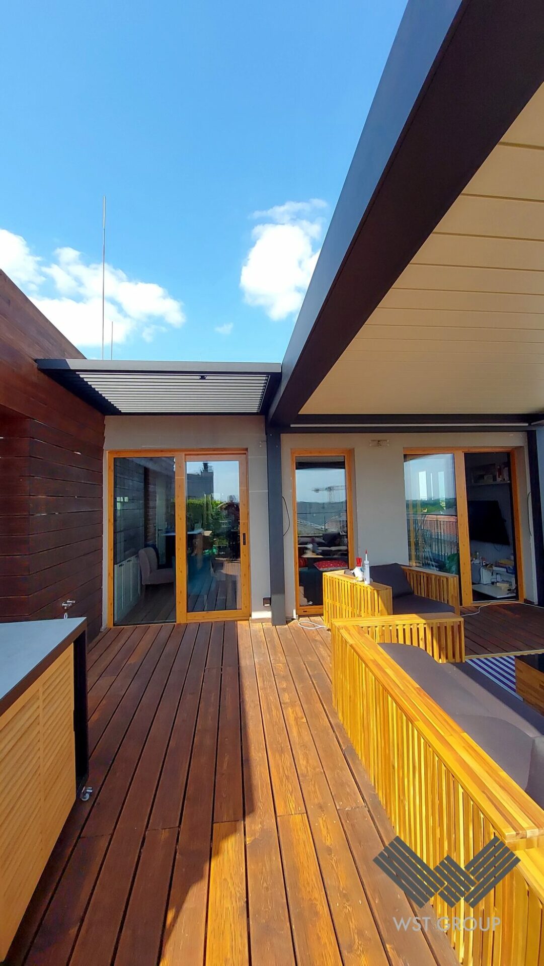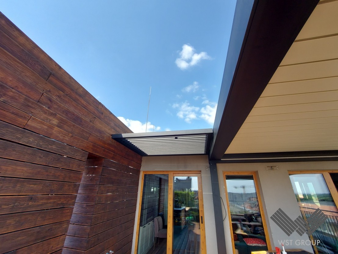 Realizacja w Poznaniu – Wilda w wykonaniu WST GROUP. Konstrukcja przeciwsłoneczna zadaszenia na tarasie. Zabudowa była wykonywana na indywidualne zamówienie zgodnie z projektem architekta. Montaż polegał na zabudowie przestrzeni pomiędzy pergolą SUNTECH a ścianą pionowa drewnianą. Zamontowane na konstrukcji aluminiowej ruchome lamele regulują ilość docierającego światła na balkonie. Dzięki temu rozwiązaniu użytkownik może komfortowo regulować ilość dostających się promieni słonecznych.