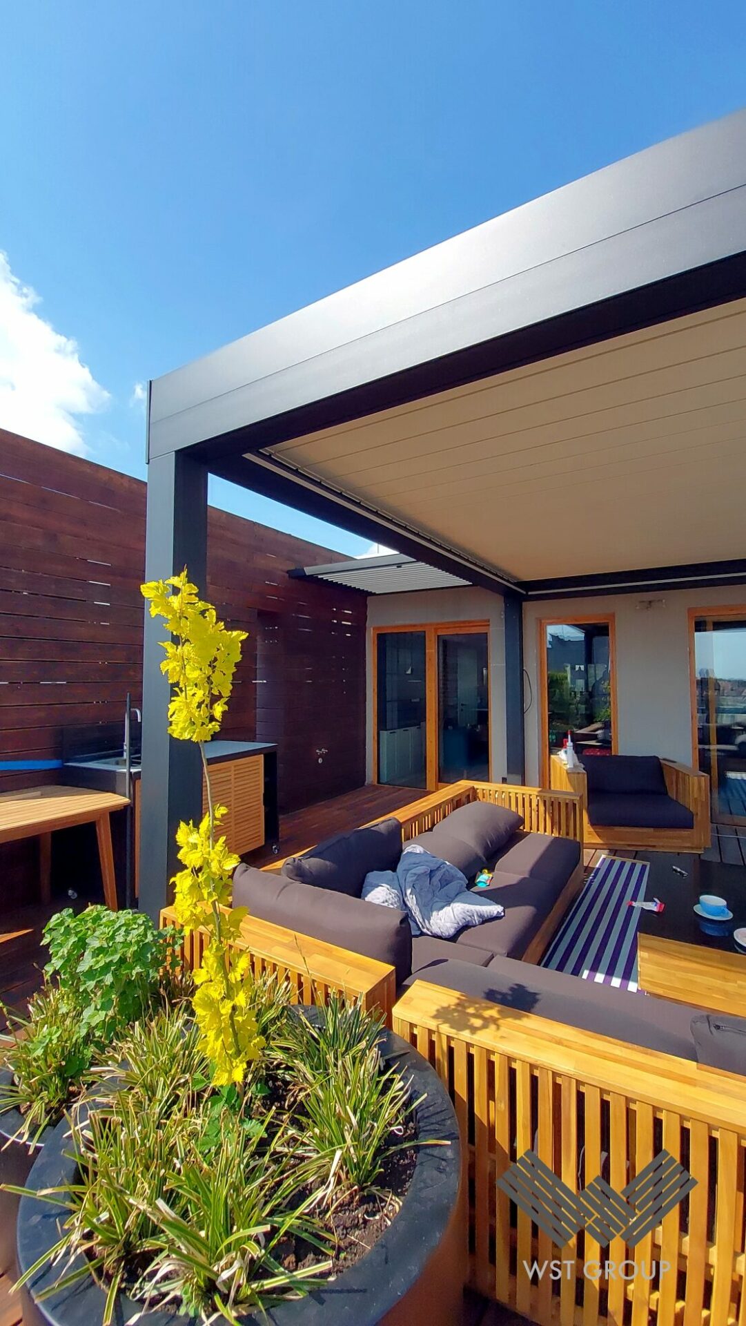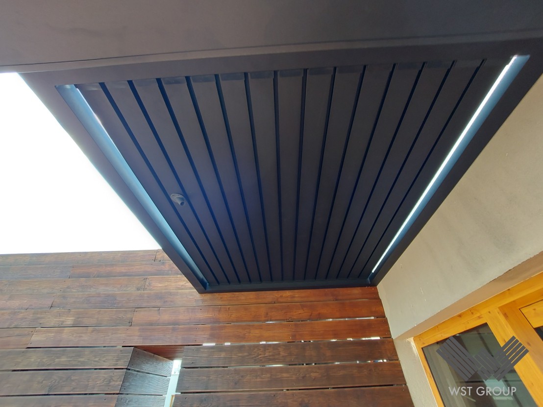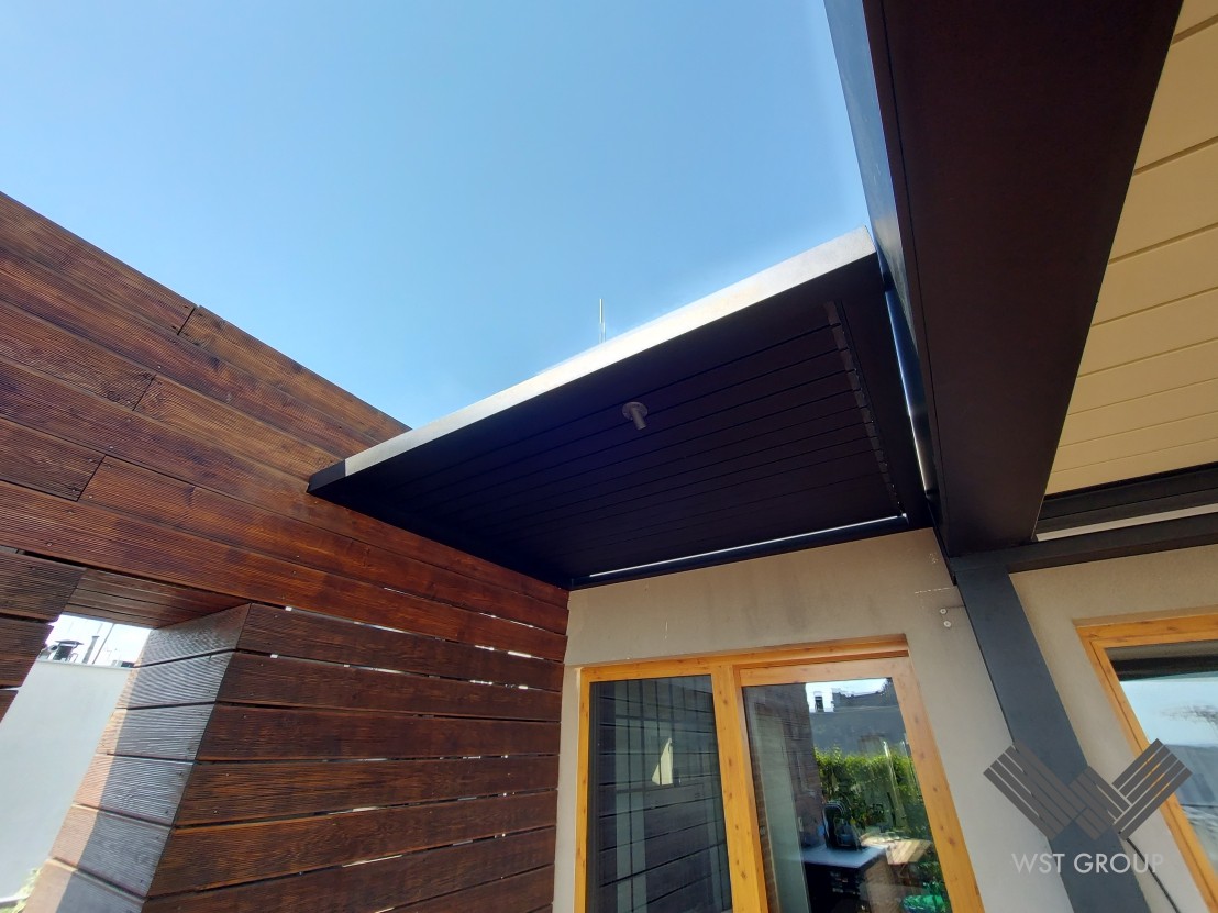 Realizacja w Poznaniu – Wilda w wykonaniu WST GROUP. Konstrukcja przeciwsłoneczna zadaszenia na tarasie. Zabudowa była wykonywana na indywidualne zamówienie zgodnie z projektem architekta. Montaż polegał na zabudowie przestrzeni pomiędzy pergolą SUNTECH a ścianą pionowa drewnianą. Zamontowane na konstrukcji aluminiowej ruchome lamele regulują ilość docierającego światła na balkonie. Dzięki temu rozwiązaniu użytkownik może komfortowo regulować ilość dostających się promieni słonecznych.